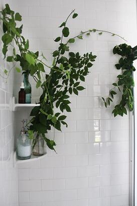 Если вам кажется, что целая оранжерея в ванной — это слишком, достаточно использовать несколько живых веток в декоре.