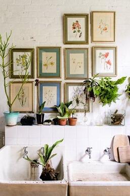 Если ванная довольно большая и хорошо проветривается, можно декорировать ее не только растениями, но и принтами с ботаническими иллюстрациями, картинами, постерами в рамках.