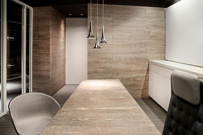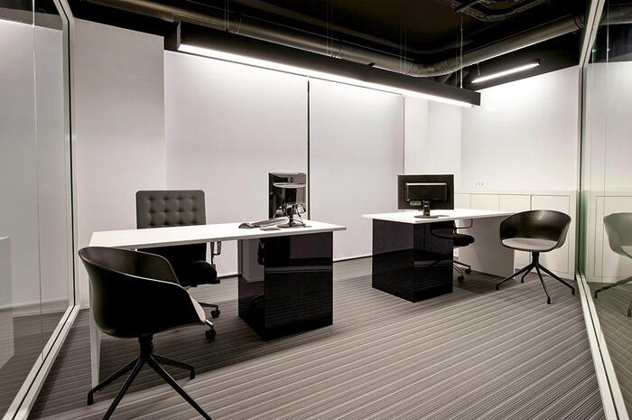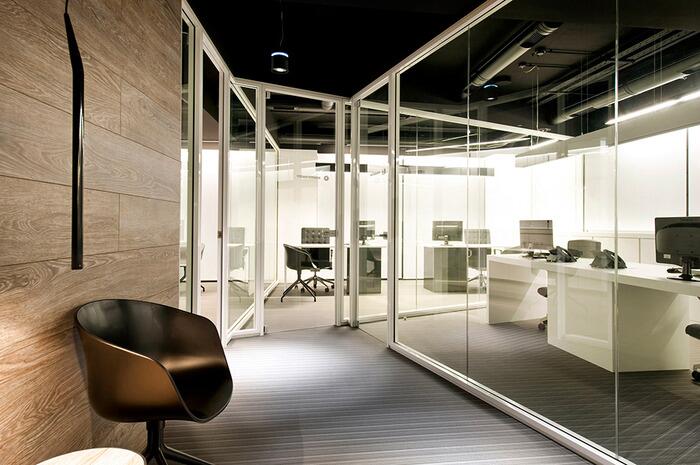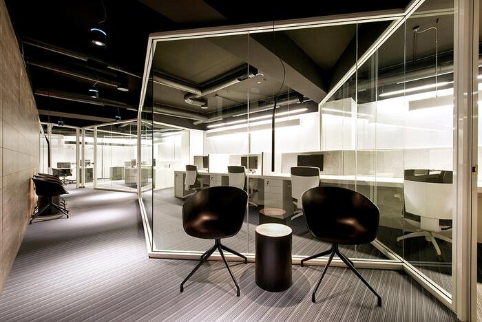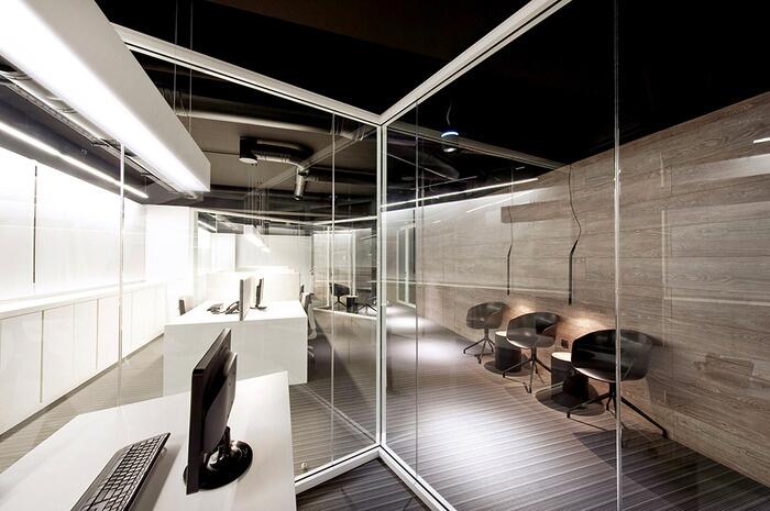 Все департаменты должны были разместиться в представительной обстановке, которая давала бы представление об уровне компании.Основными оттенками интерьера были выбраны черный (потолок), серый (пол), белый (мебель) и значительное количество натурального древесного. Зонируют рабочие помещения стеклянные перегородки, которые в некоторых случаях меняют конфигурацию в зависимости от ситуации.