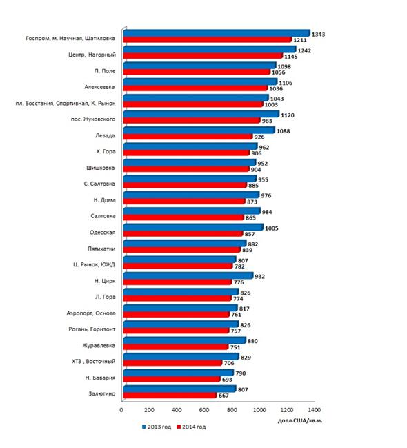 Рис. 1. Средняя цена предложения 1 кв.м. жилья на вторичном рынке Харькова по районам локальной застройки в 2013 - 2014 годах