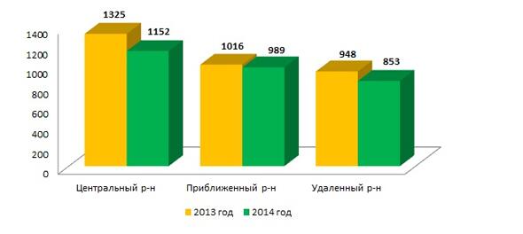 Снижение средней цены квадратного метра на рынке вторичной жилой недвижимости в 2014 году зафиксировано во всех района г. Харькова. В Центральном районе в 2014 году средняя цена предложения снизилась по сравнению с 2013 годом на ( -13 %). В приближонных района снижение средней цены составило ( -3%). В спальных районах ( -10%) см. рис. 2.