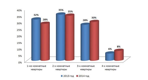 Рис. 4. Доля предложения жилья на вторичном рынке Харькова в зависимости от количества комнат в 2013 - 2014 годах