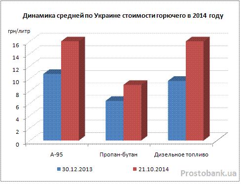 В конце октября-2014 украинцы платят за горючее вполовину или на треть больше, чем в начале года – в зависимости от вида. По данным Государственной инспекции по контролю цен, именно настолько за 10 месяцев выросла средняя по Украине стоимость горючего. Больше всего подорожало дизельное топливо – на 68%, до 16,17 гривен за литр в среднем по стране. На втором месте – бензин А-95, который вырос в цене на 53%, до 16,38 гривен за литр. А пропан-бутан подорожал на 40%, до 8,98 гривен за литр.