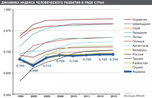 Итак, ООН фактически относит Украину ко второму миру. По итогам 1990-х мы оказались было в третьей группе стран, однако бурный экономический подъем "нулевых" позволил вернуться во вторую группу. Эксперты ООН указывают, что со времени распада СССР деградации украинцев в целом не произошло: за период с 1990-го по 2013 г. значение ИЧР нашей страны выросло с 0,705 до 0,734 (или на 4,1%). Но это — отстающее развитие: за то время, что мы прибавили в индексе
