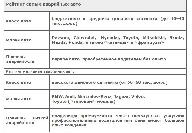 Первая закономерность, выведенная отечественными страховыми компаниями: чаще всего в ДТП попадают те авто, цена которых – от 10-15 до 40-50 тысяч долларов. Но в этом утверждении только доля правды. Ведь владельцы дешевых машин редко их страхуют (по КАСКО – только при покупке в кредит , а по ОСАГО – пытаются сэкономить, покупая полис на месяц-два), а значит, в статистике страховых случаев не значатся. Впрочем, ничего удивительного в том, что бюджетные машины часто попадают в аварии , нет – их парк более велик, причем недорогие авто чаще всего покупают водители новички, у которых малый опыт вождения, а в городах с плотным трафиком это большая вероятность попасть в ДТП.