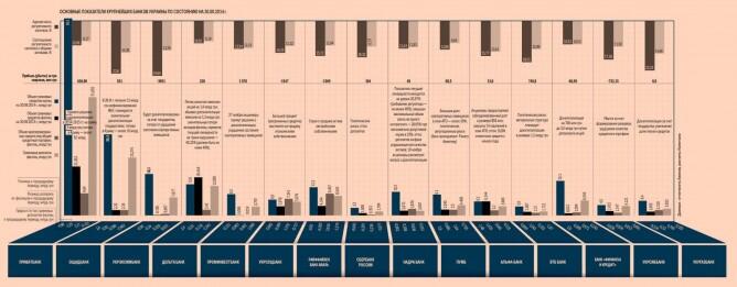 Прошедшие три квартала 2014 г. выдались крайне сложными для украинской финансовой сферы в целом и банковского сектора в частности. Весной финучреждения понесли убытки в связи с аннексией Крыма, позже им пришлось закрывать свои отделения в зоне проведения антитеррористической операции. Собственные потери украинских банков из‑за боевых действий на востоке страны, согласно сообщению министра финансов Александра Шлапака, составили около 60 млрд грн.
