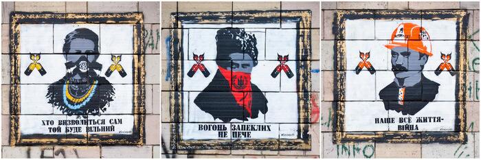 В контексте трагедии на Институтской во многом была переосмыслена и тема практически совпавшего с ней двухсотлетнего юбилея Тараса Шевченко. Кобзарь-борец в маске или несущий шину для огненной баррикады достаточно часто встречался в разных уголках города.