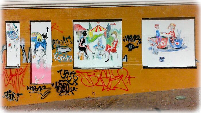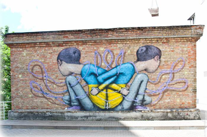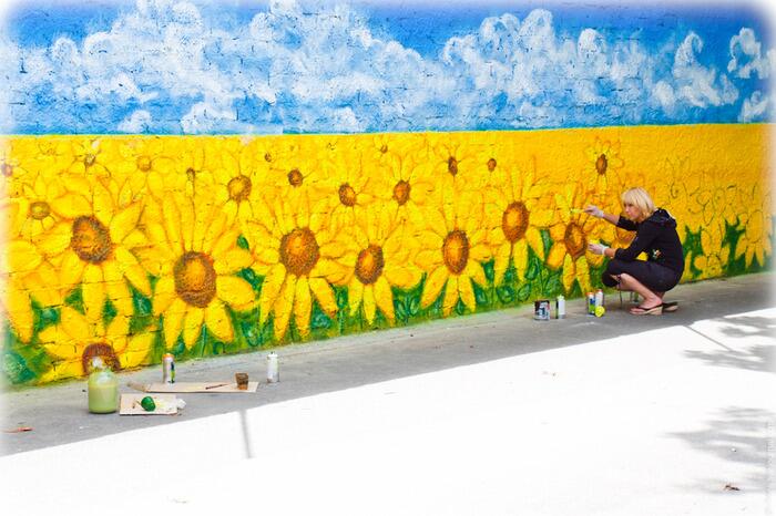 Первый полноценный мурал (граффити во всю стену), посвящённый ситуации в Украине. создал французский автор Seth (Жюльен Маллан) на электрощитовой по улице Ольгинской.