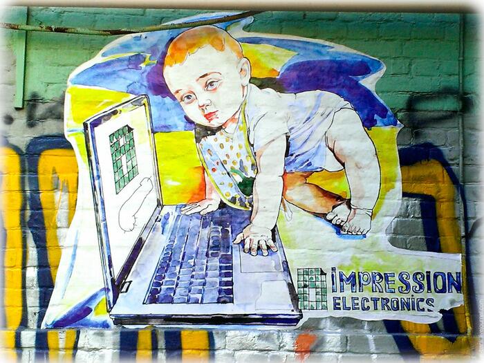 Ещё одной особенностью последних месяцев, стало использование стрит-арта в бизнес целях. Честно говоря, о том, что аппликации, представленные ниже, имеют рекламный характер, я узнал, только когда, создавая пост, полез гуглить, на какой такой «импрессионизм» они намекают. Оказалось – контора. Хотя и сюжет, и исполнение – любопытные.