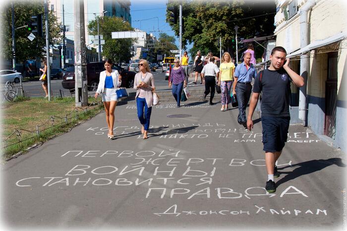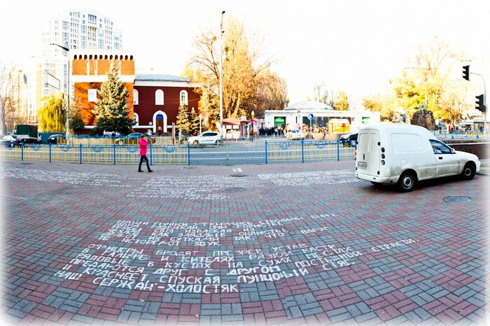Отдельно стоит выделить моду на надписи под ногами. Подобное явление часто встречается в Европе, и вот, этим летом стихи и цитаты выдающихся личностей огромными белыми буквами были начертаны наконец и на киевских улицах.
