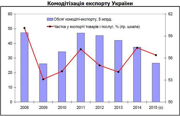 Структурно українська економіка характеризується високим рівнем «комодітізації», тобто залежності від експорту сировинних товарів або промислових товарів невисокого рівня обробки. Відповідно до оцінок Голови Ради Незалежної Асоціації Банків України Романа Шпека та Головного економіста Альфа-Банку Україна Олексія Блінова, рівень комодітізації експорту товарів і послуг з України 2015 року становив 56%, причому цей показник залишається стабільним упродовж останніх семи років.