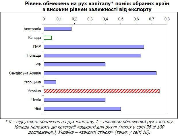 В Україні з моменту здобуття незалежності існують жорсткі обмеження на рух капіталу. За результатами дослідження на тему вимірювання рівня обмежень на рух капіталу в різних країнах світу Україна належить до найменш поширеної категорії «закриті стіною», що налічує лише 16 із 100 досліджуваних країн. Причому відповідні розрахунки робилися на базі даних 2013 року, тому є підстави вважати, що позиції України у категорії «закриті стіною» тільки закріпилися.