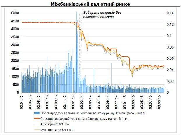 До того ж Нацбанк застосовував прямі адміністративні обмеження на операції з валютою та на рух капіталу як один із антикризових заходів у 2014–2015 роках. Так, наприклад, обмеження на міжбанківському валютному ринку були націлені передусім на заборону спекулятивних операцій та короткої позиції в гривні. Внаслідок цих обмежень обсяги продажу валюти на міжбанківському ринку різко скоротилися.