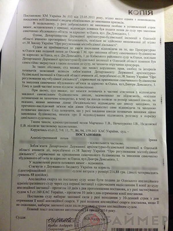 В ноябре суд решил, что пока будет разбираться в деле, достраивать многоэтажку нельзя. Нынешним решением суд обязал одесский ГАСК принять меры, «направленные на прекращение самовольного строительства и снесение самовольно построенного объекта».