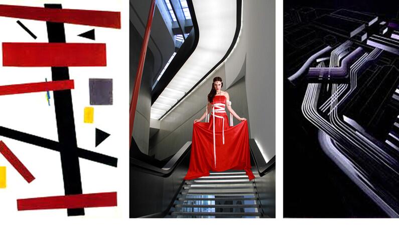 Чтобы лучше понять о чем речь, посмотрите следующее фото. Здесь мы видим супрематизм в трех направлениях: живопись, мода и архитектура.