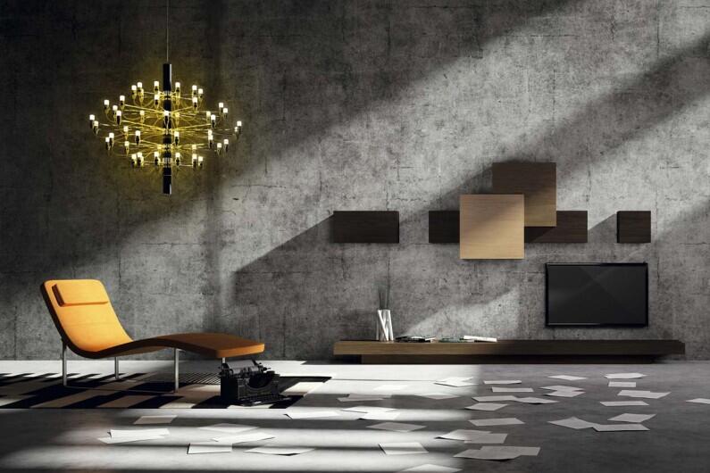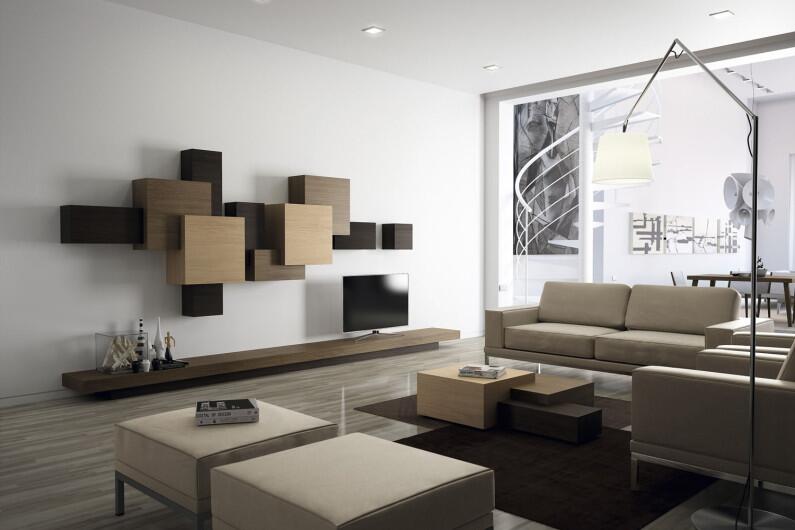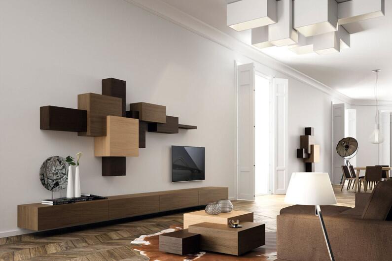 На фото ниже представлены варианты модульных настенных конструкций, с помощью которых сразу понятно намек на какой стиль сделал дизайнер. Именно намек, ведь весь остальной интерьер выдержан в минимализме и именно в таком небольшом количестве супрематизм смотрится очень уместно.