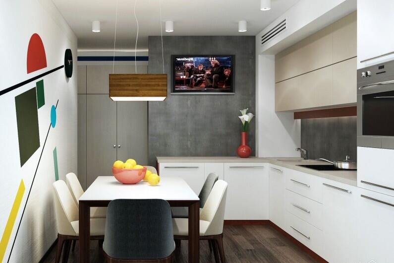 Конечно, не обязательно все стены делать белыми, можно подумать и над другими цветами. Но это обязательно должны быть цвета из любимой палитры Малевича — серый, черный, красный, желтый.