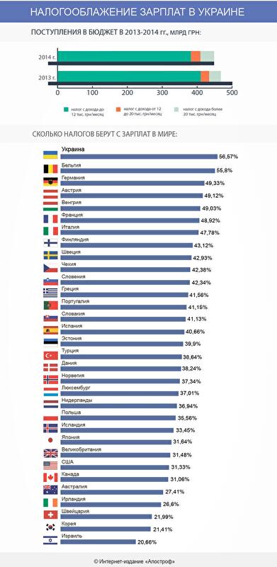 На этой неделе представители парламентской коалиции зарегистрировали законопроект, предусматривающий снижение ставки подоходного налога с 20% до 15% на доходы от 10 до 17 минимальных зарплат. На сегодняшний день эти суммы составляют от 12,1 до 20,7 тыс. грн. В Украине общая налоговая нагрузка на фонд оплаты труда составляет в среднем 56,57%, что является одним из наибольших показателей в Европе (см.инфографику). В том числе, по данным Пенсионного фонда, 36,39% – это средняя ставка Единого социального взноса (ЕСВ), который работодатель уплачивает с зарплаты каждого сотрудника. 15% от общей нагрузки – это ставка налога на доходы физлиц (НДФЛ), 3,68% – удержание с зарплаты и еще 1,5% – военный сбор.