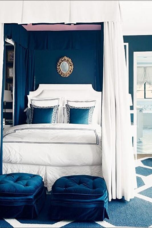 Если спальня целиком в синих тонах кажется вам не самым привлекательным вариантом, попробуйте начать с синего постельного белья. Если отделка спальни выполнена в бежевом или белом цвете, темно-синяя постель будет выглядеть очень элегантно.