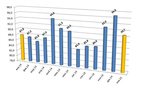 Если в январе 2014 года средневзвешенная стоимость аренды, которая учитывает как класс, так и месторасположение объекта, а также его площадь, составляла – 87,8 грн/кв.м. см. рис. 2, то в январе 2015 года значение средневзвешенной арендной ставки на рынке предложения в г. Харькове было зафиксировано на уровне - 90,7 грн./кв.м.( +3%).