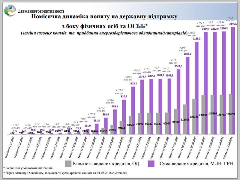 Як стало відомо Domik.ua , на заміну газових котлів та придбання енергозберігаючогообладнання станом на 24 жовтня 2016 року було виділено 2495,6 млн грн.