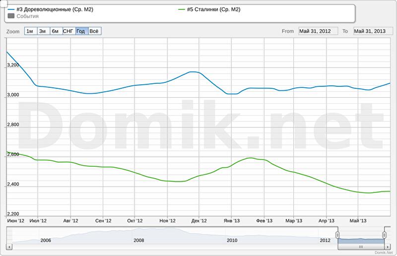Зеленая кривая – средние цены предложений в сегменте «сталинки»