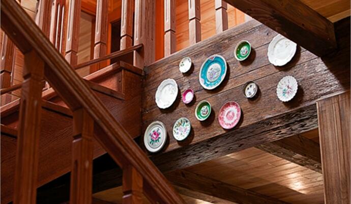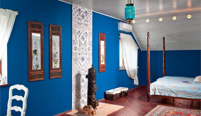 На втором этаже с тремя жилыми комнатами (спальня и две гостевые) все так же предельно просто — с простыми непростыми вещами. В неожиданно синей, средиземноморской спальне стоит раритетная печка-буржуйка (пока только как декор, но она рабочая). Здесь же — старый русский светильник из редкого цветного многослойного стекла с модными в середине XIX века китайскими мотивами. На стенах — привезенные с антикварного рынка в Пекине китайские эмали в тяжелых резных деревянных рамах. И ни одна из вещей не претендует на пафос музейного экземпляра: они здесь живые и органичные. Ими пользуются. О них заботятся. Их любят. А главное — они отвечают взаимностью, создавая атмосферу настоящего, теплого дома. Так убедительно, что враз забываешь, что дом этот только построен, что в нем еще много непроработанных деталей и не вошедших в съемку «закромов».
