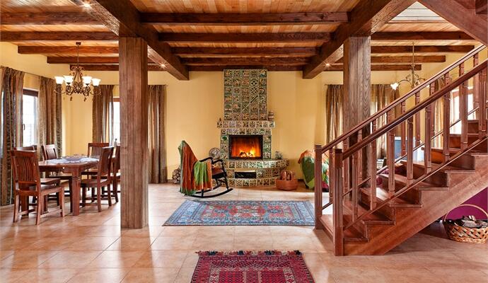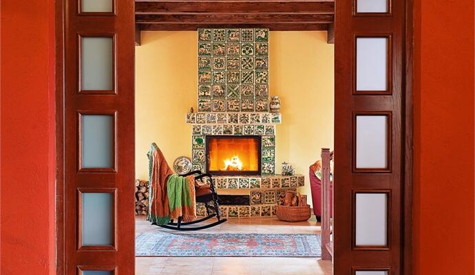 Проект действительно был нарисован и продуман Ольгой вместе с ее мужем Борисом. Все очень просто: два этажа и только необходимые помещения, натуральные материалы, минимум выразительных средств и максимум настоящих, правдивых вещей. Почти весь первый этаж заняла просторная гостиная, объединенная с зоной столовой и кухни. Прямо с порога внимание захватывает камин с изразцами косовской керамики. Разглядывать это желто-коричнево-зеленое полотно (традиционные для косовского гончарства цвета) — одно удовольствие: нет ни одной повторяющейся плитки. Все изразцы — ручная работа с узнаваемым почерком Галины и Михаила Трушиков. Интересная керамическая «история» и в зоне кухни. В стройный ряд современной настенной плитки вписано несколько старинных иранских изразцов из натуральной лазури, привезенных из Иерусалима. А прямо в тело деревянного стола вживлена сюжетная испанская керамика — винтажная плитка была найдена на развалах блошиного рынка в Бегуре.