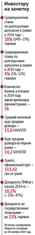 Пока граждане забирают гривну из банков, специалисты, напротив, призывают размещать в них вклады в нацвалюте. "Гривневые депозитные ставки на сегодня являются одними из самых высоких в мире (если сравнивать с вкладами в национальных валютах в других странах. — Фокус). Даже в кризисное время Фонд гарантирования вкладов физлиц исправно компенсирует застрахованные депозиты, поэтому риск гривневых вложений на сумму до 200 тысяч гривен является довольно низким", — убеждён Алексей Соболев. Собеседник Фокуса считает, что пик девальвации уже пройден, и если не возобновятся широкомасштабные военные действия, курс стабилизируется на уровне 12 –13 UAH/USD. Ещё один аргумент в пользу гривневого депозита апеллирует к национальной сознательности украинцев. Ведь опустошая банковские счета и скупая наличный доллар, они подрывают банковскую систему и экономику.