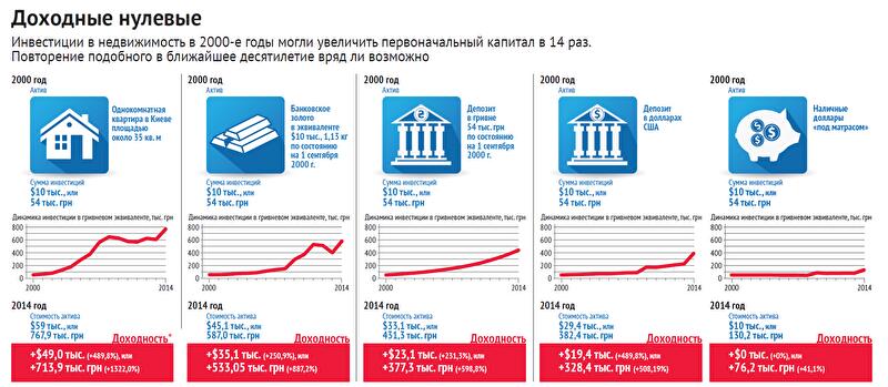 Размещение $10 тыс. на депозитном счету за прошедшие 14 лет принесло инвесторам куда меньшую прибыль, нежели золото и недвижимость. Доходность за весь период по депозиту в гривне (в долларовом эквиваленте) составила около 231%, по вкладу в американской валюте — 194%. "В Украине выгоднее хранить деньги на гривневых депозитах. Если делать это постоянно, доходность вложений будет выше, чем у депозитов в инвалюте, даже учитывая периодическую девальвацию гривны", — констатирует управляющий активами КУА "Драгон Эсет Менеджмент" Алексей Соболев.