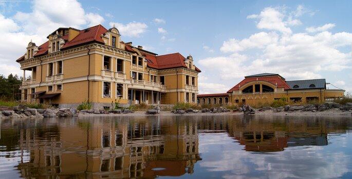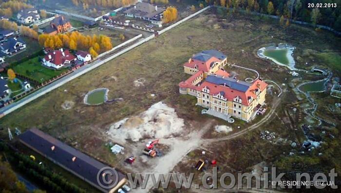 Сама резиденция располагается посреди леса, в трех километрах от трассы, в 16 километрах от Киева. Парковая территория поделена на зоны: водоем, возле входа в дом декоративный партер, тематические сады, барбекю. Но оформлением их придется заняться новым хозяевам. Пока только выполнены инженерные работы по системам дренажа и ливнеотвода, проведены электрические и слаботочные сети. При желании возможно сделать теннисный корт на участке с подготовленной дренажной системой. Уже выполнены работы по обустройству технических озер, озера с водопадом и гротом.