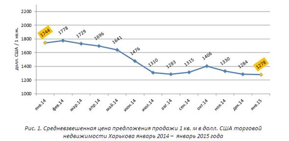 Январь 2015 года для рынка торговой недвижимости стал тяжёлым ударом. Стоимость кв.м. торговой недвижимости снизилась до уровня 1278 долл.США/кв.м., это на 27 % ниже по сравнению с январем 2014 года.
