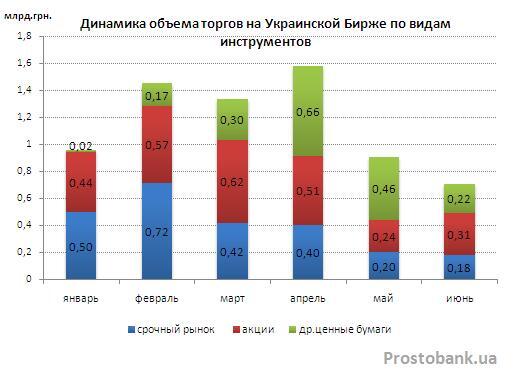 Июнь-2013 отметился также минимальным с начала 2013 года объемом операций на срочном рынке – менее 180-ти миллионов гривен. Немного увеличилась по сравнению с маем-2013 лишь сумма сделок с акциями – с 243-х до 312-ти миллионов гривен. Но это выглядит закономерным: судя по динамике индексов украинских фондовых площадок, акции второй месяц подряд понемногу дорожают.