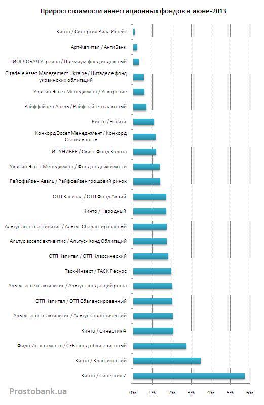 Июнь-2013 стал для украинских инвестиционных фондов гораздо менее «урожайным», чем май. С положительным финрезультатом месяц закончили всего 24 фонда из 67-ми (против 41-го в мае), а наибольший размер прибыли равнялся 5,73% (против 14,87% в мае). Рекордсменом июня-2013 стал фонд «Синергия 7» (КУА «Кинто») – плюс 231 гривна на сертификат или 5,73% прибыли. На втором месте оказался фонд «Классический» той же КУА с результатом 11,7 гривен на сертификат или почти 3,5% прибыли.