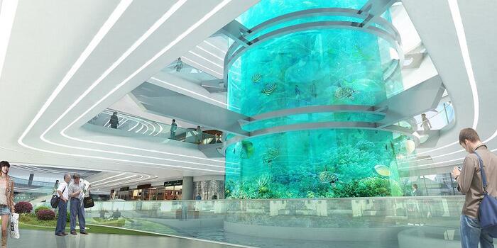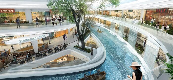 Здание площадью 350 тысяч квадратных метров предусматривает девять уровней торговых и развлекательных площадей с огромным вертикальным аквариумом, фонтаном, крытым каналом, многоуровневыми зелеными террасами и аркой с LED-экраном в верхней части.