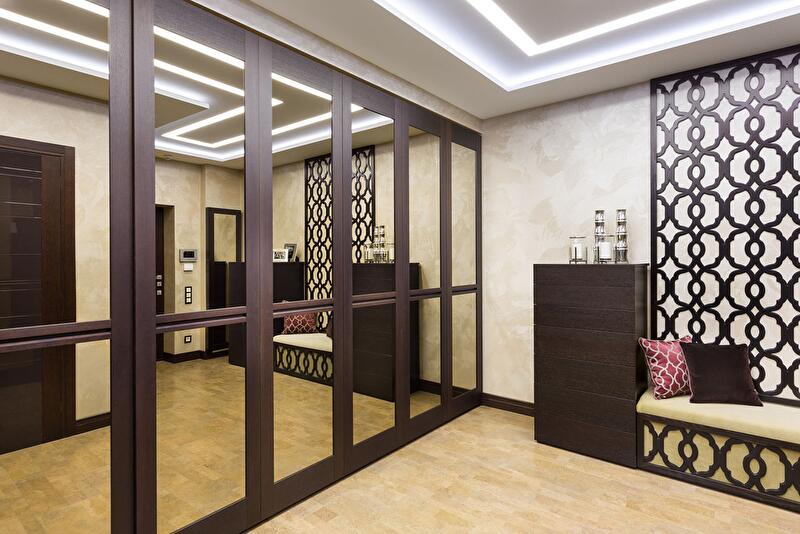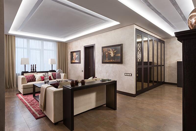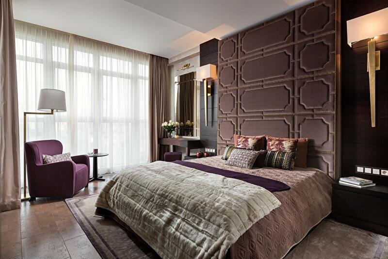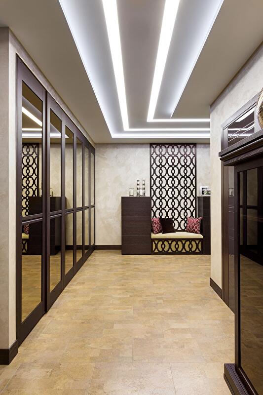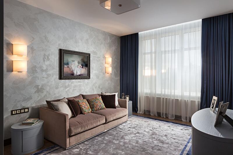 К цветовому исполнению отнеслись с большой осторожностью – среди предложенных цветов декоративной штукатурки были единогласно выбраны цвет тортора для основной гостевой зоны квартиры, теплый лиловый в хозяйской спальне и серебристо-серый в гостевой, поскольку она является самой жаркой западной комнатой.