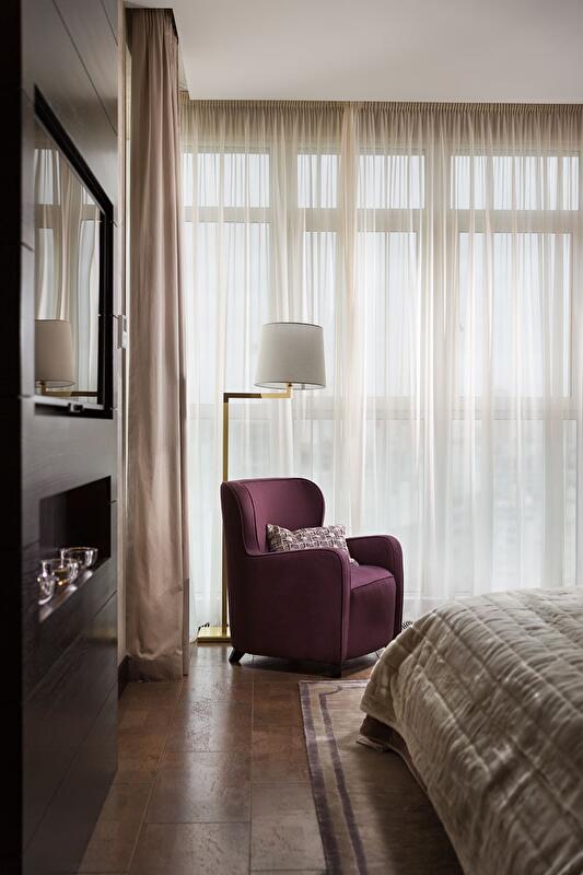 «Никакой синтетики и пестроты – только качественный и экологичный материал в спокойных и натуральных оттенках» – заказчики четко обозначили нам свои предпочтения. Поэтому выбор пал на натуральные ткани от Fabricut, Robert Allen, Michaile Textiles. Предметы декора мы подбирали у салона немецкой мебели и аксессуаров для дома Domicil – это вазы, рамы для фото, свечи, декоративные подушки и пледы. Все картины были выбраны в галерее «Небо». Живопись белорусского художника Андрея Задорина и картина в гостевой спальне – собственность салона Domicil.