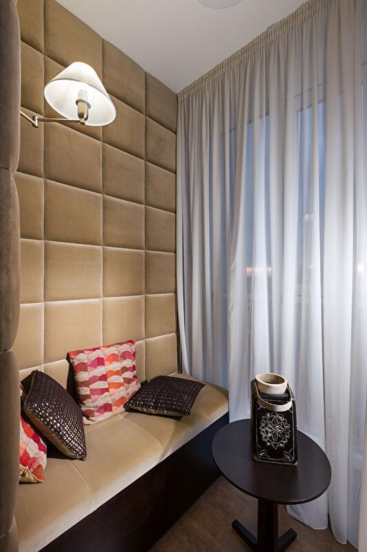 Большое количество вещей заказчиков мы разместили в объемном шкафу входной зоны и в шкафу спрятанном в нишу спальни. Также мы сделали ставку и на дополнительные места для хранения: пуф в прихожей оснащен откидным механизмом и имеет сказочный объем для домашней обуви. Таким же способом мы нашли место для хранения пледов и подушек на застекленной лоджии – в этом нас технически поддержали мастера компании «Декор», с которыми мы сотрудничали по созданию индивидуальных предметов для данного интерьера.