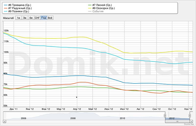 Так почему же Троещина показывает такие результаты? Напрашивается вывод, что спрос на квартиры на Троещине формирует дешевизна жилья, а точнее — одна из самых низких в Киеве стоимость квадратного метра. И действительно, рассмотрев графики стоимости квадратного метра по массивам, мы видим, что дешевле метр лишь на ДВРЗ и в Бортничах. Но там свои особенности.
