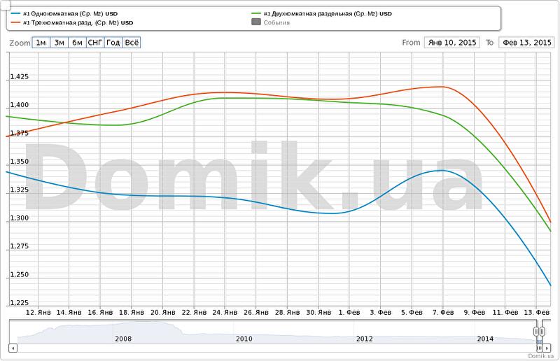 Цены предложений квартир в долларе стремительно опускаются. За последнюю неделю стоимость киевских «трешек» снизилась до 1 299 $ за кв.м (-8.5%). Это неудивительно в сложившихся условиях: национальная валюта стремительно девальвирует, а с долларом покупатели расстаться не готовы – в результате спрос на жилье упал до минимума. При этом цена предложений трехкомнатных квартир в гривне по итогам недели составила 33 125 грн (+1.5%), что объясняется падением официального курса гривны при фиксации цен на жилье в долларе.