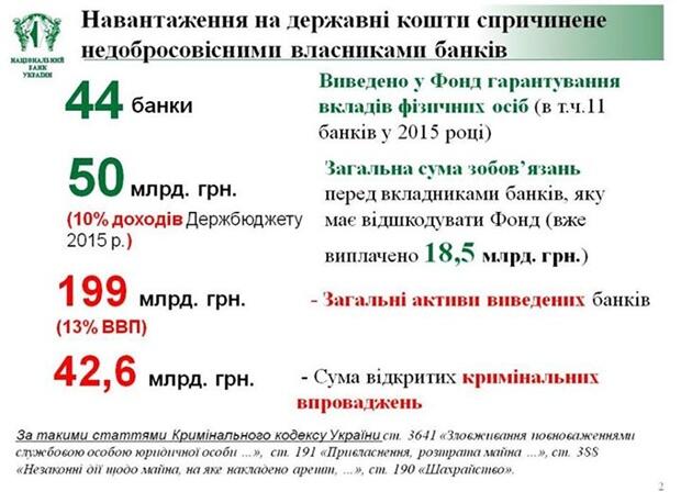 «Приведу цифры Фонда гарантирования: на сегодня общая сумма убытков, нанесенных неплатежеспособными банками из-за противоправных действий акционеров банков и их должностных лиц, составляет более 58 млрд грн. Сейчас уже открыто 239 уголовных дела на общую сумму почти 43 млрд грн», - сказала Гонтарева.