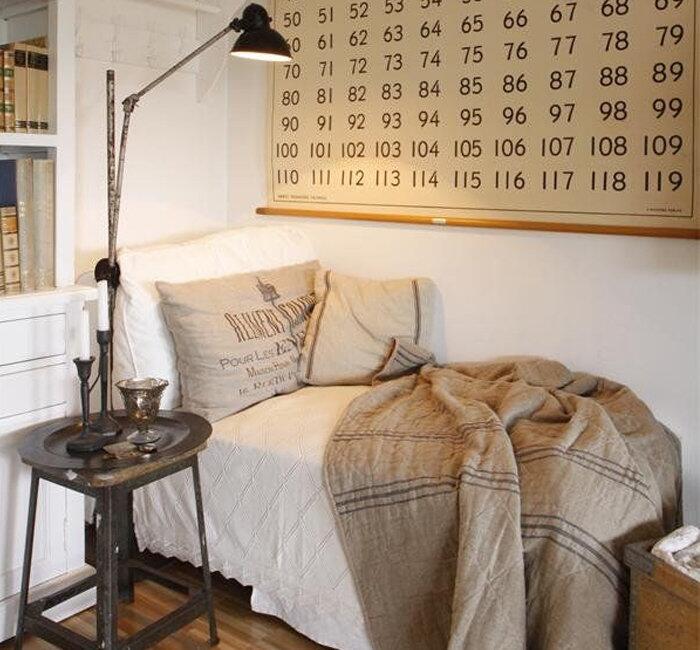 Кушетка, скамья или сундук с пледом и несколькими подушками удачно впишутся в выбранный уголок нестандартных параметров, например, в самый угол комнаты, отгороженный ширмой, открытым стеллажом или книжным шкафом.