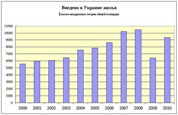 Как сообщалось со ссылкой на Государственную службу статистики, в Украине 2010 г. введено в эксплуатацию 9,3 млн. кв. м жилья, что на 45,9% больше, чем в 2009 г.; в 2009 г. – 6,4 млн. кв. м (на 39% меньше к 2008 г.); в 2008 г. - 10,495 млн. кв. м жилья (на 2,5% больше к 2007 г.); в 2007 г. - 10,244 млн. кв. м жилья (на 18,7% больше к 2006 г.).