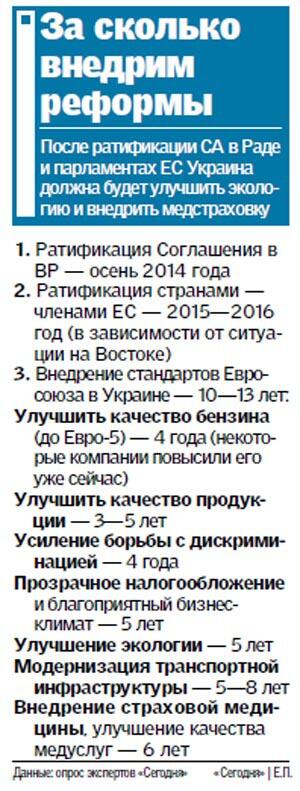 РЕФОРМЫ . Официально Соглашение начнет действовать после ратификации нашей Радой и парламентами 28-ми стран-членов ЕС. Процесс этот, по данным МИДа, может растянуться и на 2—3 года. Но, по словам Павла Климкина, главы всех стран-членов и правительств ЕС на саммите в Брюсселе обещали Петру Порошенко с ратификацией не затягивать.