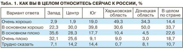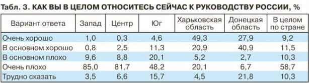 И еще несколько цифр: в Донецкой области хорошо и очень хорошо относятся к России 84,3%, к россиянам — 90,4%, к руководству России — 68,8%. В Харьковской области эти цифры составляют 79,9, 91 и 70,1% соответственно.