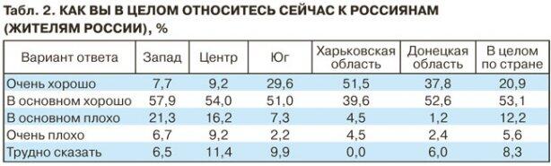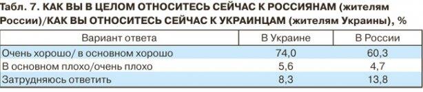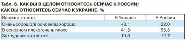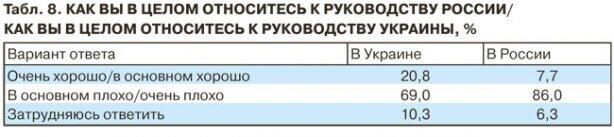 А в России положительно относятся к жителям Украины только 60% населения. И еще наблюдается существенная разница в отношении к руководству двух стран: в Украине 21% населения положительно относятся к руководству России — конечно, в основном за счет восточных областей, — а в России к руководству Украины позитивно расположены всего 7,7% населения.