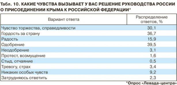 — "Левада-центр" задавал россиянам вопрос: "Как вы думаете, какие чувства вызывает присоединение к России Крыма у украинцев?" И в этом вопросе наблюдалась существенная динамика: все больше россиян стало осознавать, что, вероятно, украинцам такое положение дел не очень нравится…