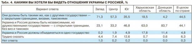 — Количество людей, которые хотели бы объединения двух государств в одно, в Украине все время уменьшается. Максимум был в 2009 году — 23%, в мае 2013 — 14%, а сейчас — 5% (здесь и далее выделено мной. — И.К.) Кстати, россиян, желающих жить с нами в одной стране, также немного — 7%. Происходит дальнейшее падение уровня приятия друг друга украинцами и россиянами.