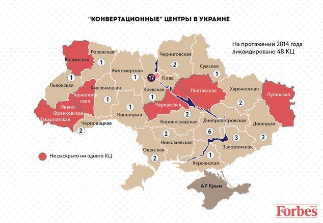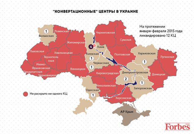 В продолжение серии материалов о неформальном секторе экономики Украины, Forbes публикует карту конвертационных центров, пока что – раскрытых государственными органами. Оперативными подразделениями Государственной фискальной службы за первые два месяца 2015 года были ликвидированы 12 «конвертов». Ориентировочные потери бюджета от их деятельности оцениваются в 382 млн гривен. Это более чем вдвое превышает показатели за аналогичный период года 2014-го: тогда налоговики закрыли 5 конвертационных центров, которые нанесли бюджету убытки в размере свыше 72,3 млн гривен.