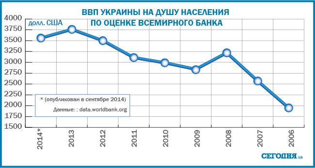 В частности, Всемирный банк зафиксировал, что ВВП Украины на душу населения (рассчитывался по методу Атласа – оценка на базе сглаженного за три года валютного курса) в 2014 по сравнению с 2013 годом уменьшилось на 200 долл. до 3560 долл. До этого долгое время этот показатель демонстрировал стойкий рост: от 1950 долл. в 2006 до 3760 в 2013 году.